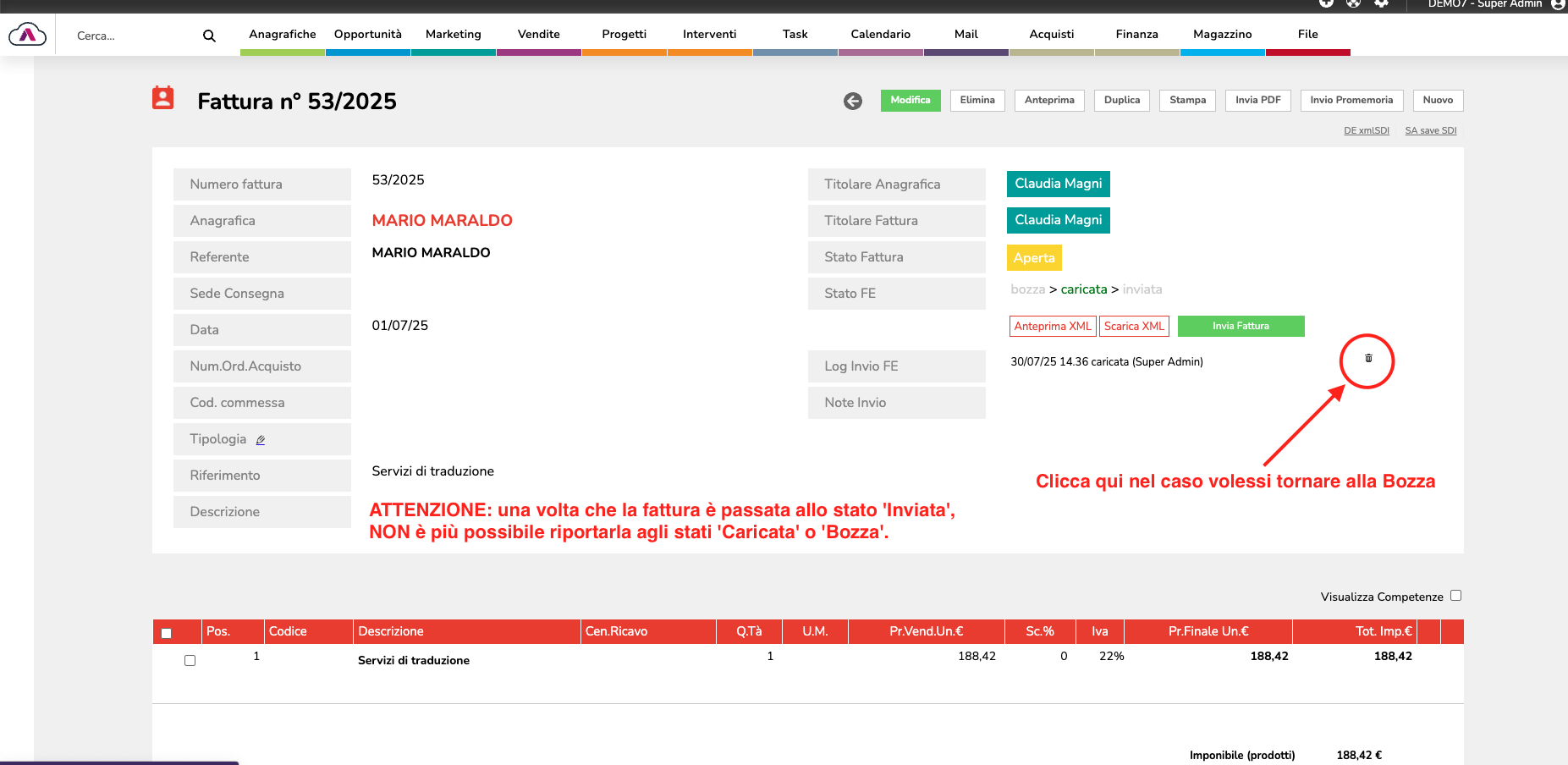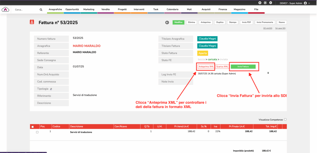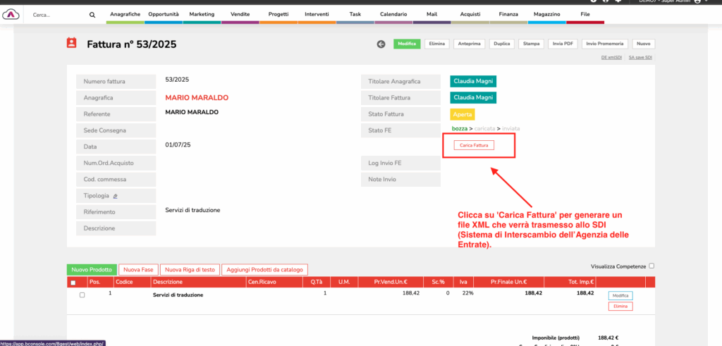3. In alto a destra, troverai l’opzione per caricare e inviare la fattura allo SDI.